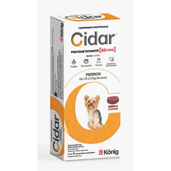 Comprimido masticable con sabor a carne, fácil de administrar. Brinda protección contra pulgas, garrapatas y parásitos internos. Duración: 60 días